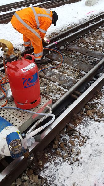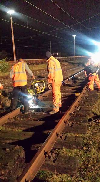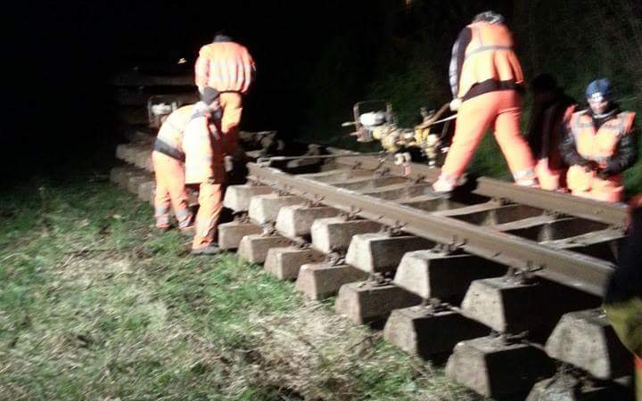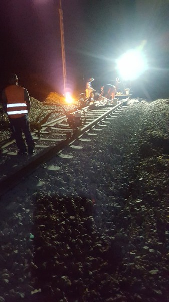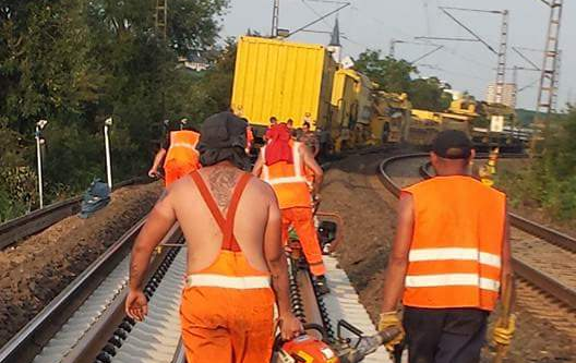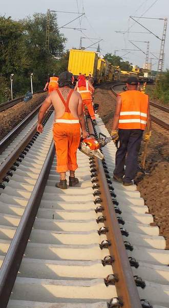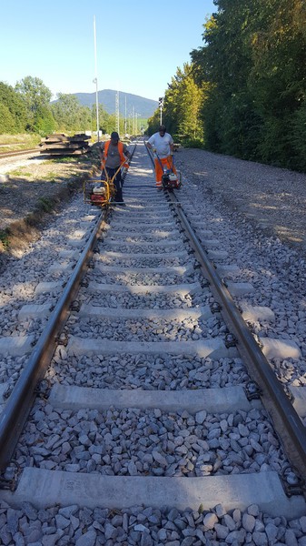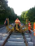 Umbauzug, Kleineisenbehandlung, Gleis- und Weichenrückbau, Stopfarbeiten von Hand an Gleisen und Weichen, sowie Randweg,- Planierarbeiten.